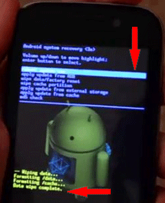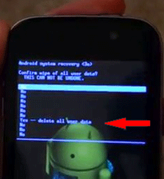 Demak , Telefonimiz sistemasiga kirib oldik. Endi Ovoz + yoki Ovoz – tugma orqali pastga "Wipe data / factory reset” ni ustiga tushib, ok tugmani bosamiz. Bu vaziyatda ok tugmani ro’lini "Yoqish” tugmasi o’ynaydi. Xullas "Wipe data / factory reset” ni ustiga kelib Androidimizni "Yoqish tugmasini bosamiz. Yana bir bor aytaman bu amalni bajarayoganda telefon xotirasidagi fayllar o’chib ketadi.